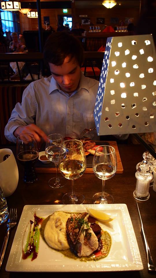 Testiin pääsi erämaajärven hiillostettu siika (palsternakkapyrèe, nokkosvoisoosia, paahdettua punajuurta) ja äijälankku (naudan entrecote 250g, hirvimakkara, karitsawursti, lohkoperunoita, karamellisoitua sipulia, portersoosia). Siinähän sitten päättelette kumpi söi kumpaa! Jälkkäriksi naposteltiin retrohelmeä – eli uunijäätelöä (Huuskolan vaniljajäätelöä, keksimurua, marjoja ja mesiangervomarenkia)
