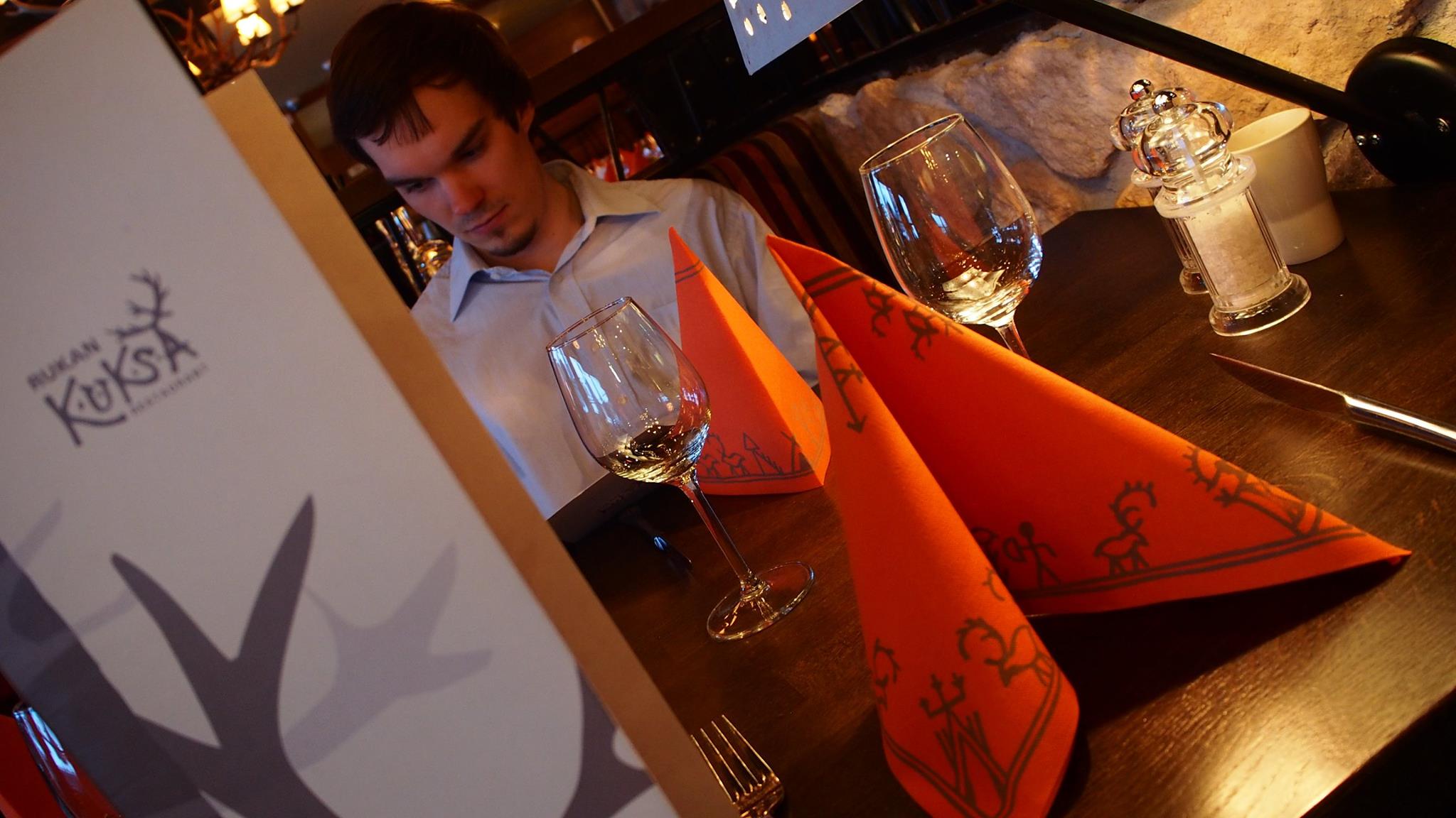 Tulipa myös minun vuoroni päättää ravintolasta. Olin jo loman alussa iskenyt silmäni Ravintola Rukan Kuksaan ja allekirjoittaneen oli p-a-k-k-o päästä sinne. Puhdasta, paikallista lähiruokaa – kuulosti juuri siltä mistä tykkään. Kuksassa nautittiin Rukareissumme viimeinen illallinen ja haluttiin varata pöytä etukäteen. Rakastan ikkunapöytiä ja kysäisin varatessani että olisiko mahdollista saada pöydää ikkunan vierestä. Tunnelmaa latisti se seikka että kaikki ikkunapöydät ovat kuulemma vähintään kuuden hengen pöytiä – no se sitten siitä. Toivottavasti joskus tulevaisuudessa on myös kahdelle hengelle ikkunapaikkoja.
