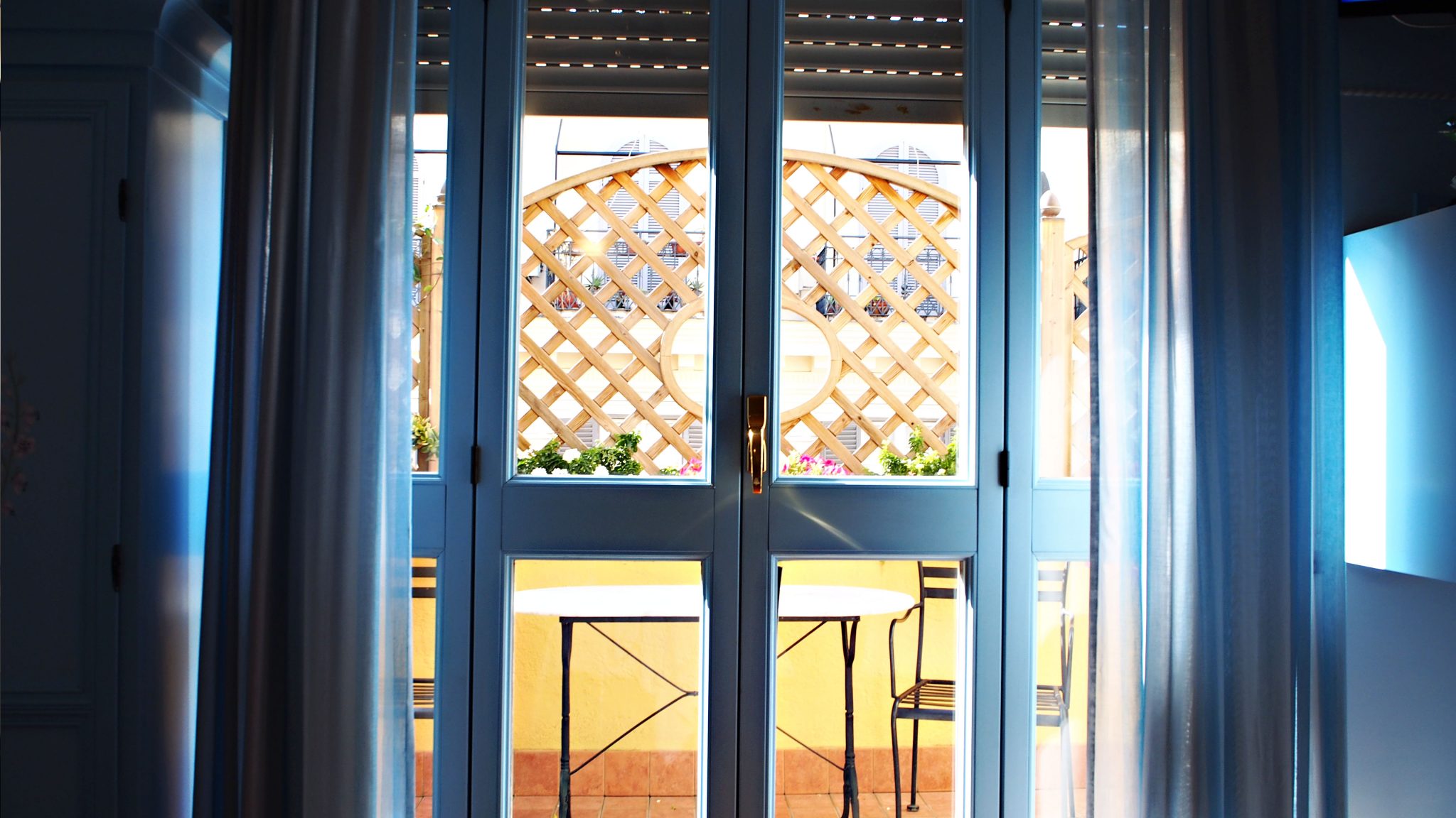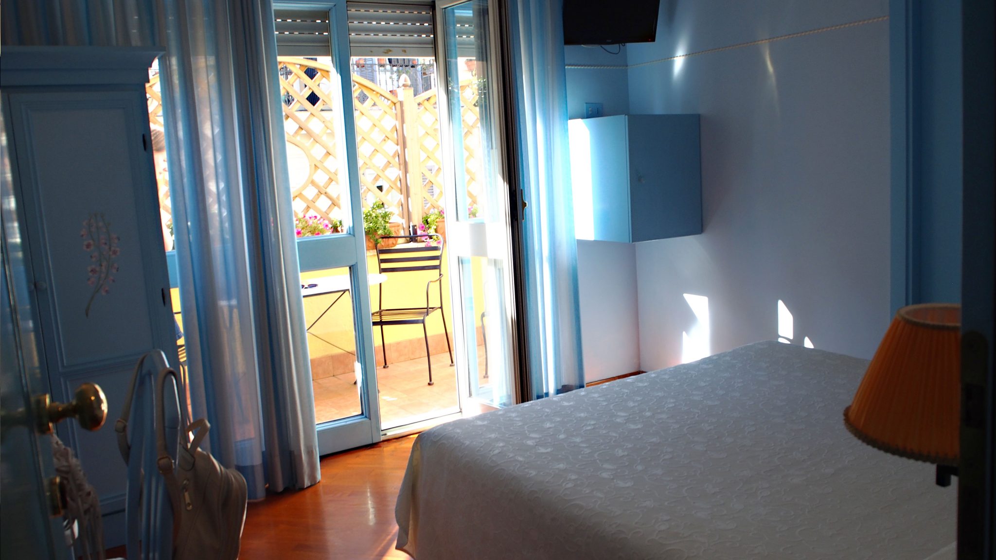 Roomassa on niin paljon hotellivaihtoehtoja, että hotellivalinnassa meinasi iskeä pieni epätoivo. Pohdin ja pohdin, mutta en saanut mielestäni Lilium Hotellia, jonka sijainti oli hyvä ja huoneet niin ihanan ällöpastellisävyiset. Kävipä sitten niin, etten vain voinut vastustaa tätä pastellipläjäystä ja varasin majoituksen sieltä. Hotellin löysin Milja Köpsin opasroomaan.fi hotellivinkeistä ja hotelli oli juuri sellainen kuin Milja kuvaili. Ihanaa, että tiesi tismalleen mitä odottaa. Meidän huoneemme oli sininen peach blossom, jonka parvekkeella oli kukkia. Huone oli aika pieni, mutta juuri sopiva kahdelle. Remontoidusta kylpyhuoneesta löytyi kylpyamme.